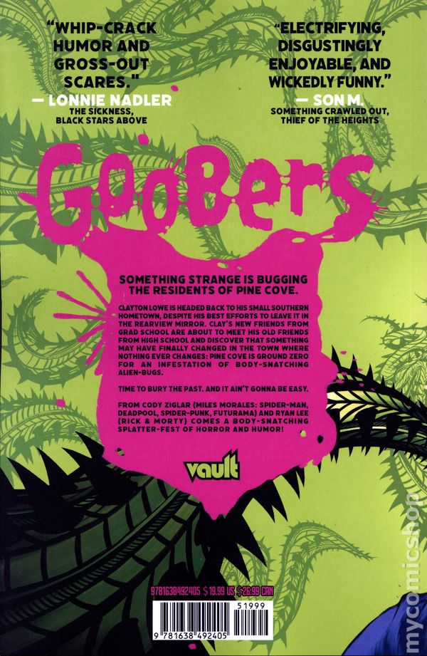 1st printing. Collects Goobers (2024 Vault) #1-3. Written by Cody Ziglar. Art and Cover by Ryan Lee. Clayton Lowe is headed back to his small Southern hometown, despite his best efforts to leave it in the rearview mirror. Clays new friends from grad school are about to meet his old friends from high school and discover that something may have finally changed in the town where nothing ever changes: Pine Cove is ground zero for an infestation of body-snatching alien-bugs. Time to bury the past. From Cody Ziglar (Miles Morales: Spider-Man, Spider-Punk, Futurama) and Ryan Lees (Rick & Morty) comes a body-snatching splatter-fest of horror and humor! Softcover, 128 pages, full color. Teen+ Cover price $19.99.