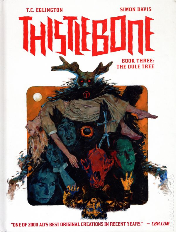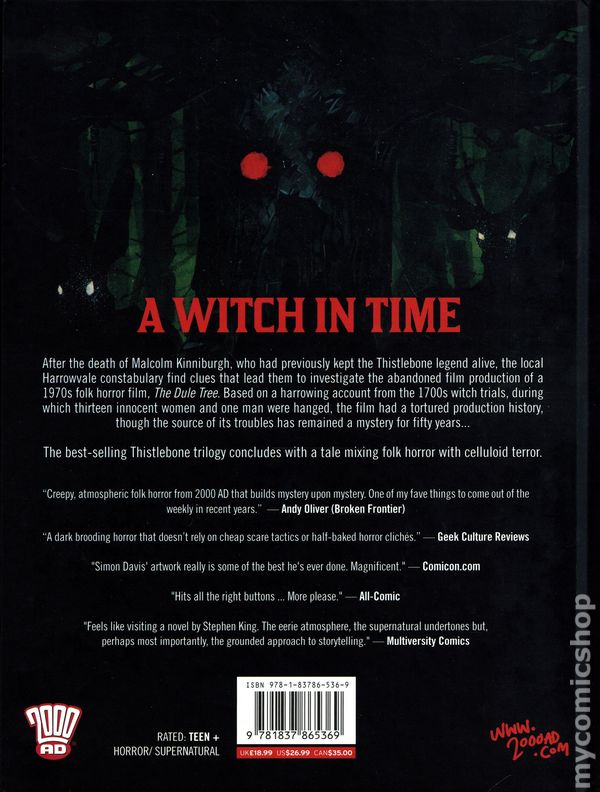 Volume 3 - 1st printing. "The Dule Tree!" Written by Tom Eglington. Art and cover by Simon Davis. After the death of Malcolm Kinniburgh, who had previously kept the Thistlebone legend alive, the local Harrowvale constabulary find clues that lead them to investigate the abandoned film production of a 1970s folk horror film, The Dule Tree. Based on a harrowing account from the seventeen hundreds where thirteen innocent women and one man were hanged during the witch trials, the film itself ran into production problems, the source of which has remained a mystery for fifty years. Hardcover, 80 pages, full color. Teen+ Cover price $26.99.