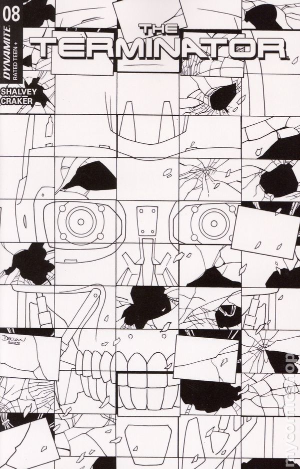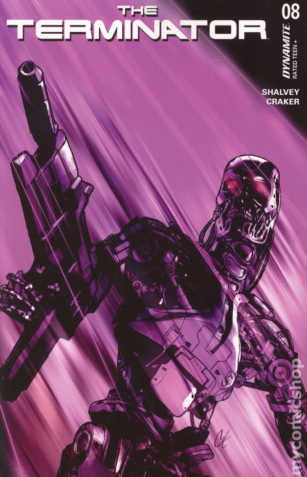 Written by Declan Shalvey. Art by Colin Craker. Cover by Declan Shalvey. NO FATE BUT WHAT THEY MAKE! The story of the darkest days of the war against the machines, and the grizzled veteran who helped guide John Conner to his ultimate victory over Skynet, comes full circle in this issue, leading inexorably to a final, fatal confrontation - or so it might seem! The enhanced neural nets of author DECLAN SHALVEY and artist COLIN COKER descend into the uncanny valley with The Terminator #8 - fortified by flawlessly fabricated covers by SHALVEY, EDWIN GALMON, CAT STAGGS, and DAVID COUSENS! 32 pages, full color. Rated T+ Cover price $4.99.