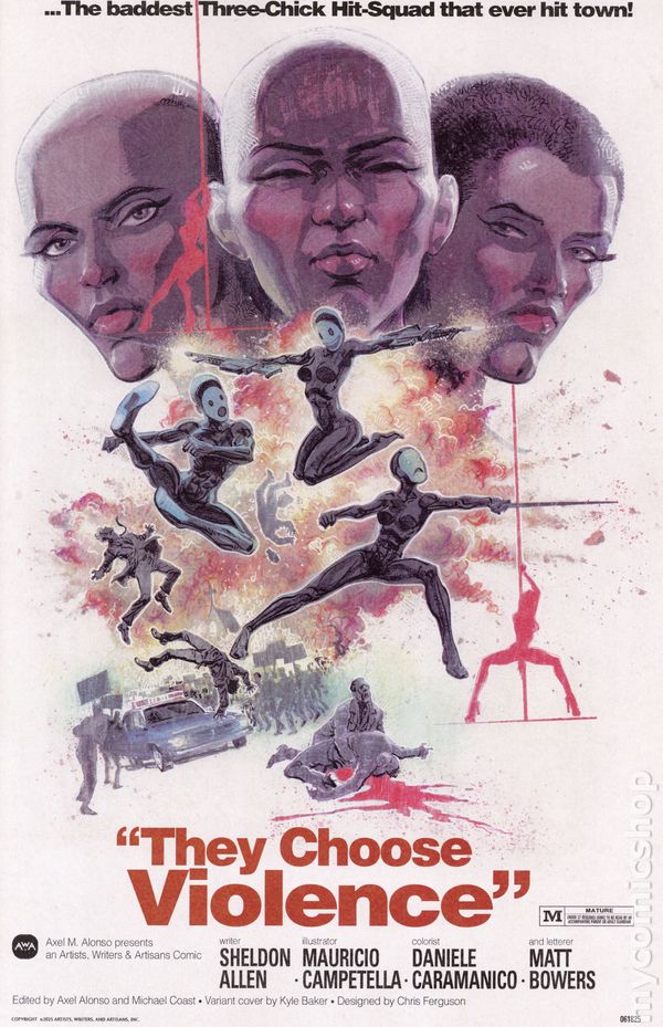 Written by Sheldon Allen. Art by Mauricio Campatella. Cover by Kyle Baker. Laneka, Deidre and Karen, three HBCU besties turned professional career women, enraged by the systemic injustice plaguing their community, band together to form a vigilante squad that targets White Supremacists deemed to have circumvented the justice system and gotten away with protected murder. Serving up grisly justice in increasingly creative ways, the vigilante posse becomes front-page news while always staying one step ahead of the law. Its liberating, its addictive and its kinda fun – until a copycat killer emerges. They Choose Violence asks what happens when you go down the dark, unforgiving road of revenge? What happens when the only path forward is escalation? Theres no turning back now – for anyone. 32 pages, full color. Rated M Cover price $4.99.