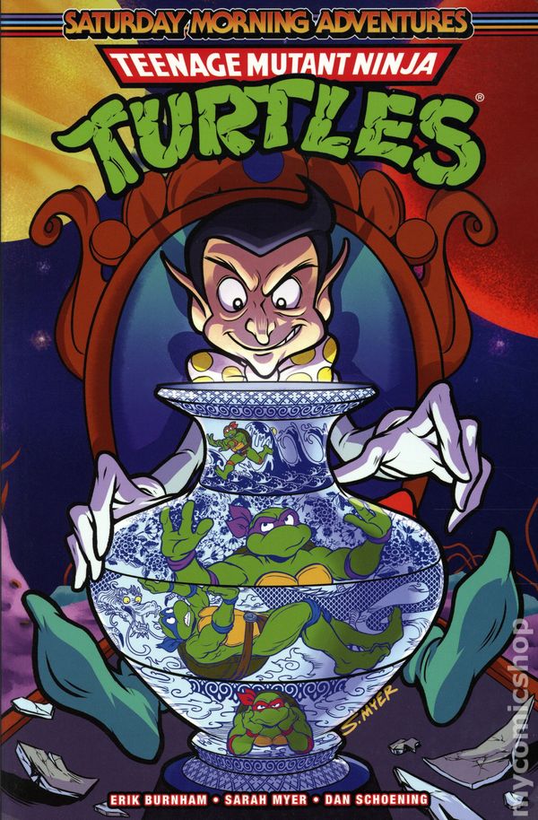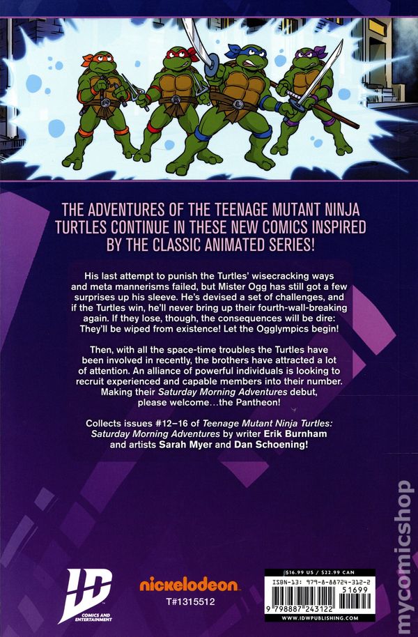 Volume 5 - 1st printing. Collects Teenage Mutant Ninja Turtles: Saturday Morning Adventures (2023 IDW) #12-16. Written by Erik Burnham. Art by Sarah Myer and Dan Schoening. Cover by Sarah Myer. Mister Ogg is back! His last attempt to punish the Teenage Mutant Ninja Turtles' wisecracking ways and meta mannerisms failed, but Mister Ogg has still got a few surprises up his sleeve. He's devised a set of challenges, and if the Turtles win, he'll never bring up their fourth-wall-breaking again. If they lose, though, the consequences will be dire: They'll be wiped from existence! Let the Ogglympics begin! Then, with all the space-time troubles the Turtles have been involved in recently, the brothers have attracted a lot of attention. An alliance of powerful individuals is looking to recruit experienced and capable members into their number. Making their Saturday Morning Adventures debut, please welcome... the Pantheon! Softcover, 120 pages, full color. Cover price $16.99.
