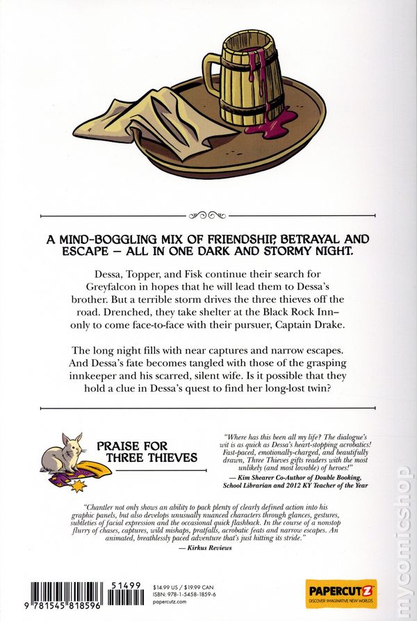 Volume 2 - 1st printing. "The Sign of the Black Rock!" Story and art by Scott Chantler. A mind-boggling mix of friendship, betrayal and escape – all in one dark and stormy night. Dessa, Topper, and Fisk continue their search for Greyfalcon in hopes that he will lead them to Dessa's brother. But a terrible storm drives the three thieves off the road. Drenched, they take shelter at the Black Rock Inn--only to come face-to-face with their pursuer, Captain Drake. The long night fills with near captures and narrow escapes. And Dessa's fate becomes tangled with those of the grasping innkeeper and his scarred, silent wife. Is it possible that they hold a clue in Dessa's quest to find her long-lost twin? Hardcover, 6 1/2-in. x 9-in., 128 pages, B&W. All Ages Cover price $19.99.
