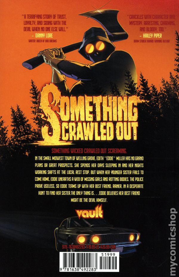 1st printing. Collects Something Crawled Out (2024 Vault Comics) #1-4. Written by Son M. Art and Cover by Cas Madcursed Peirano. Something wicked crawled out screaming. Edith "Eddie" Miller has no grand plans or great prospects. She spends her days sleeping in and her nights working shifts at a gas station. But when her younger sister fails to come home, Eddie unearths a web of missing girls and rotting bodies. The police prove useless, so Eddie teams up with her best friend, Rainer, in a desperate hunt to find her sister. The only thing is—Eddie believes her best friend might be the Devil himself. Softcover, 208 pages, full color. Teen+ Cover price $19.99.