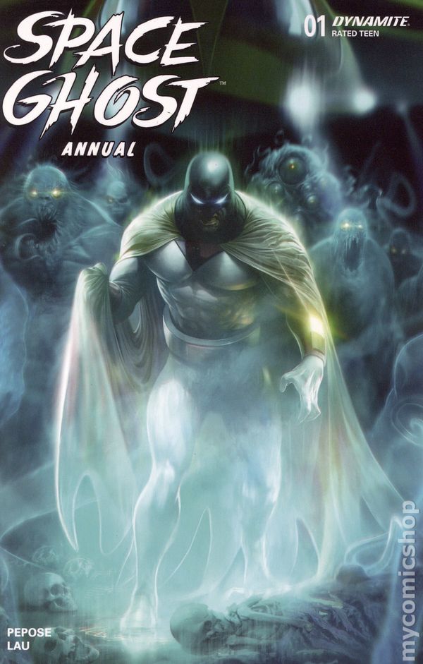 Written by David Pepose. Art by Jonathan Lau. Cover by Jae Lee, June Chung. After the thrilling events of issue #12's second-story-arc finale, the fine-tuned creative team of DAVID PEPOSE and JONATHAN LAU pull out all the stops for their very first Space Ghost Annual! With the Council of Doom seemingly defeated, our heroes now face a terrifying new threat-one that strikes from beyond the fourth dimension! To have any hope of survival, Space Ghost and his crew must find a way to break the dominion of... TEMPUS THE TIME-MASTER! Featuring 28 action-packed story pages. 40 pages, full color. Rated T Cover price $5.99.