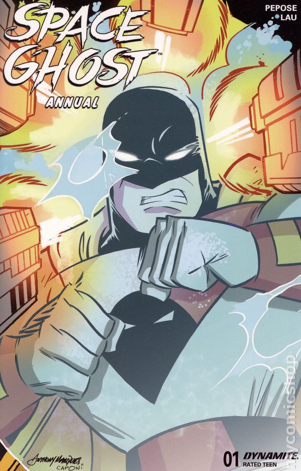 Limited 1 for 10 Retailer Incentive Variant Cover. Written by David Pepose. Art by Jonathan Lau. Cover by Anthony Marques. After the thrilling events of issue #12's second-story-arc finale, the fine-tuned creative team of DAVID PEPOSE and JONATHAN LAU pull out all the stops for their very first Space Ghost Annual! With the Council of Doom seemingly defeated, our heroes now face a terrifying new threat-one that strikes from beyond the fourth dimension! To have any hope of survival, Space Ghost and his crew must find a way to break the dominion of... TEMPUS THE TIME-MASTER! Featuring 28 action-packed story pages. 40 pages, full color. Rated T Cover price $5.99.