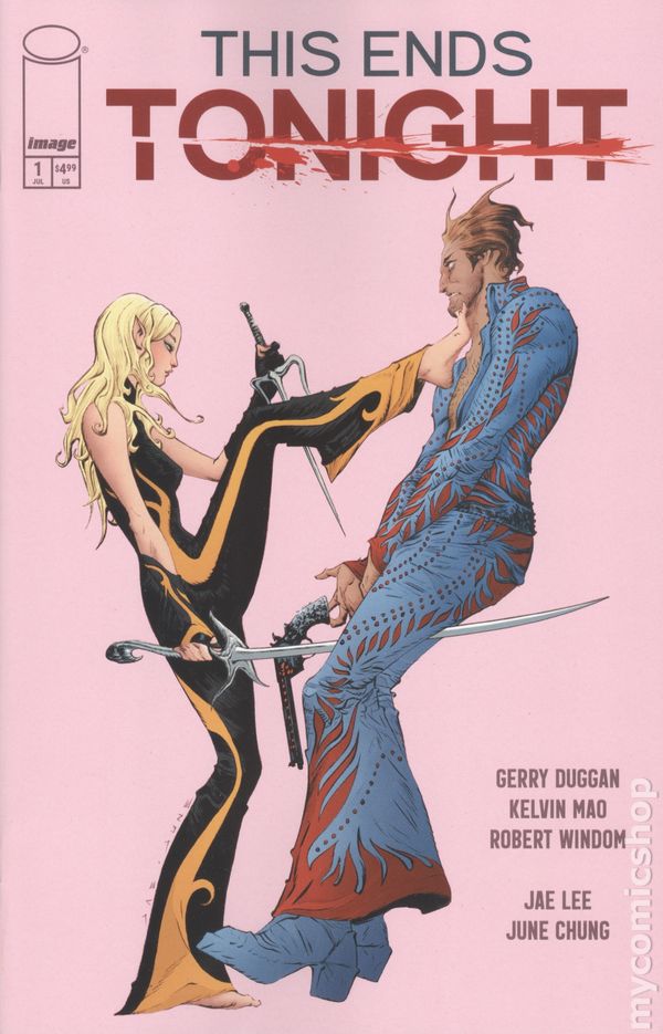 Written by Gerry Duggan; Kelvin Mao, Robert Windom. Cover and Art by Jae Lee, June Chung. MINISERIES PREMIERE The pulse-pounding comic event of the summer aims for your jugular, courtesy of master artist JAE LEE (Inhumans, SEVEN SONS) and GERRY DUGGAN (X-Men, FALLING IN LOVE ON THE PATH TO HELL). THIS ENDS TONIGHT is the kick-off of three interconnected tales of bloody revenge in Las Vegas. The debut issue stars two sisters hunted by assassins for their shocking family secret. It's an over-sized, action-packed romp, and every panel is crushed with love by JAE. 40 pages, full color. Rated M Cover price $4.99.