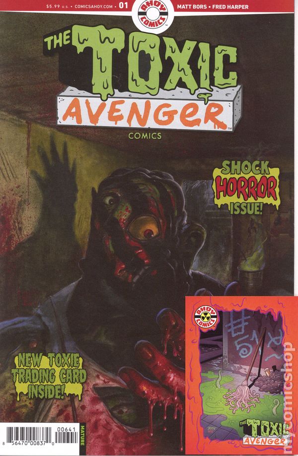 Written by Matt Bors. Art and Cover by Fred Harper. You demanded it, so here it is: a new ONGOING series featuring the movies' grossest hero, masterminded by the hit creative team from 2024's TOXIC AVENGER miniseries! In this issue's self-contained horror story, kids are disappearing from Toxie's hometown of Tromaville, NJ. Did they simply run away from the chemically polluted town? Or is the real explanation even more frightening? Find out before the new TOXIE film hits theaters, THIS SUMMER! 28 pages, full color. Rated M Cover price $5.99.