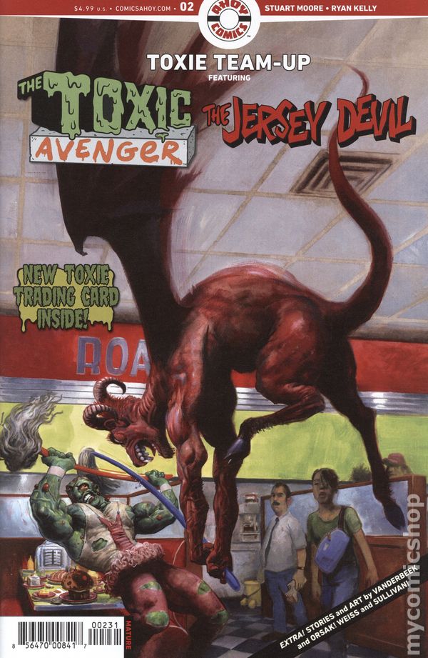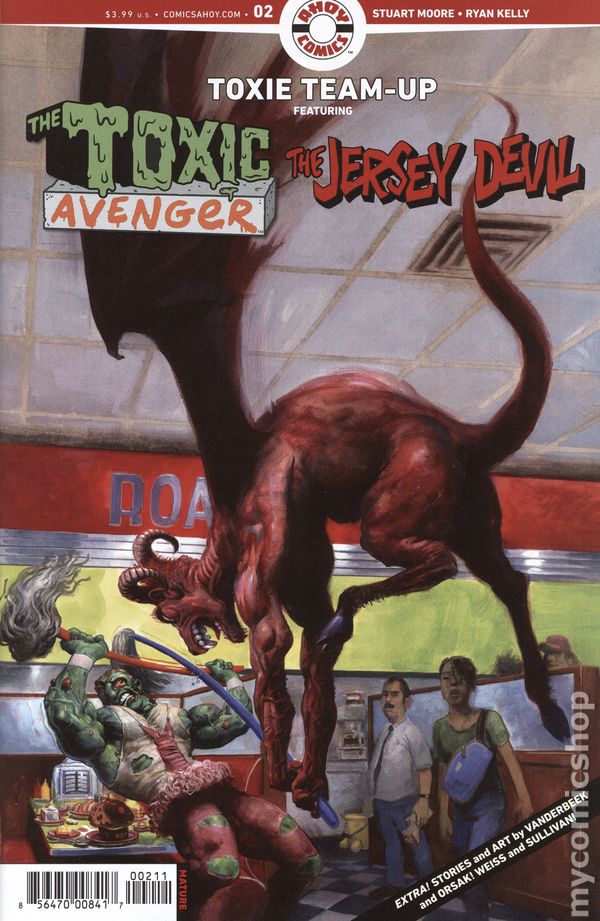Written by Stuart Moore. Art by Ryan Kelly. Cover by Fred Harper. Continuing the Toxic Avenger's tour of what we laughingly call the AHOY Universe! Following his meeting with Jesus Christ, the Avenger returns to his roots for an epic brawl with the Jersey Devil in-where else?-a sinister diner. Script by the Garden State's own Stuart Moore (Captain America for Dummies) with art by midwestern interloper Ryan Kelly (Local, Dead Boy Detectives) and cover by master Toxie artist Fred Harper! 28 pages, full color. Rated M Cover price $4.99.
