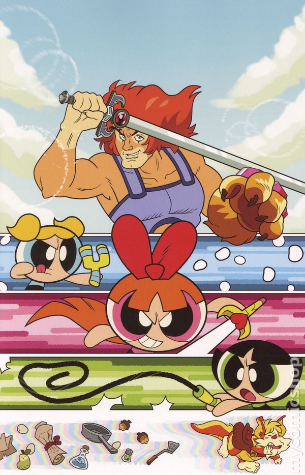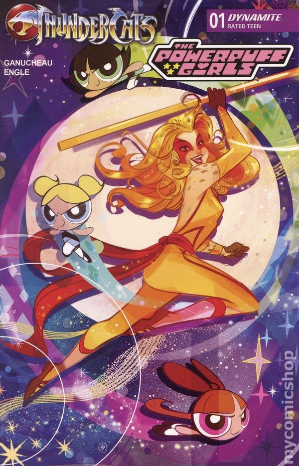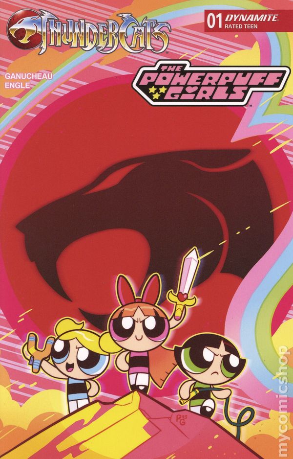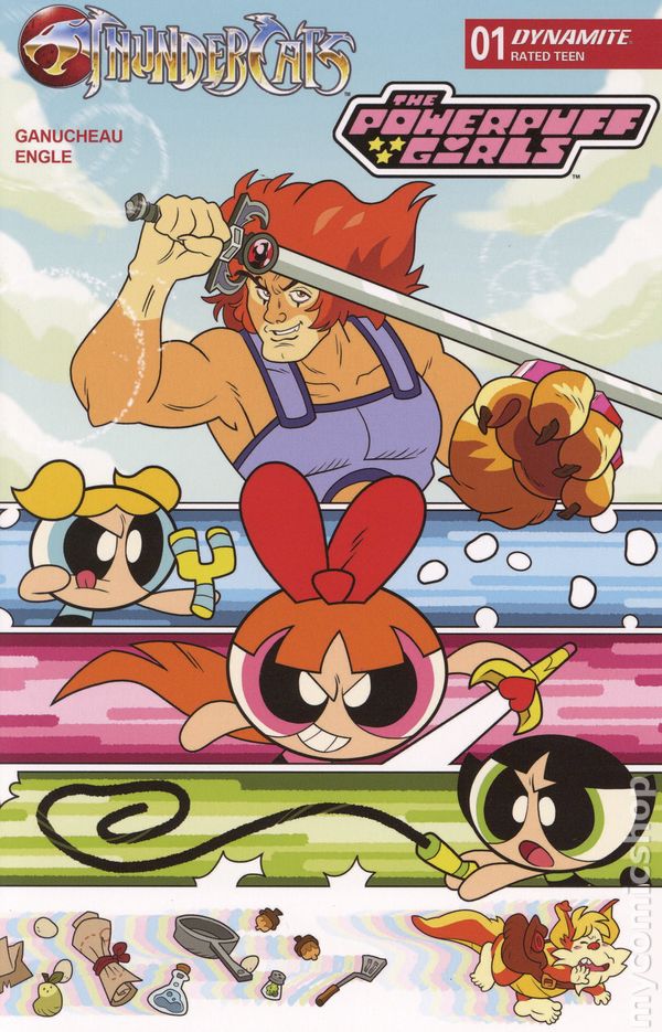 Written by Paulina Ganucheau. Art by Coleman Engle. Cover by Paulina Ganucheau. In the greatest crossover since peanut butter met jelly, The Powerpuff Girls travel from Townsville to Third Earth and discover the world of the ThunderCats! After being trapped in a runaway rocket by Mojo Jojo, the titanic trio find themselves on a strange planet where their super-powers don't work. Luckily, someone named Snarf is there to provide a situation report and wouldn't you know it, there's evil that needs defeating! But without their Chemical X-enhanced abilities, what can Bubbles, Blossom, and Buttercup do against a foe like Mumm-Ra? Find out as writer PAULINA GANUCHEAU and artist COLEMAN ENGLE open up the Treasures of Thundera in the first issue of ThunderCats/The Powerpuff Girls featuring instantly iconic covers from GANUCHEAU and ENGLE as well as CORAN KIZER STONE, SAOWEE, and NICOLETTA BALDARI! 32 pages, full color. Rated T Cover price $4.99.