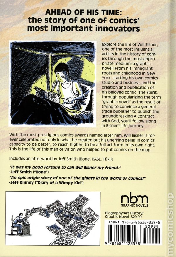 1st printing. Written by Stephen Weiner. Art and cover by Dan Mazur. Explore the life of Will Eisner, one of the most influential artists in the history of comics through the most appropriate medium: a graphic novel! From his immigrant roots and childhood in New York, starting his own comics studio and business, and the creation and publication of his beloved comic, The Spirit, through popularizing the term "graphic novel" as the result of trying to convince a general trade publisher to publish the groundbreaking A Contract with God, you'll follow along in Eisner's life journey. With the most prestigious comics awards named after him, Will Eisner is forever celebrated not only in what he created but his unerring belief in comics' capacity to be better, to reach higher, to be a full art form in its own right. Includes an afterword by Jeff Smith (Bone, RASL, Tüki)! Hardcover, 6 1/2-in. x 9 1/2-in., 296 pages, full color. Cover price $29.99.