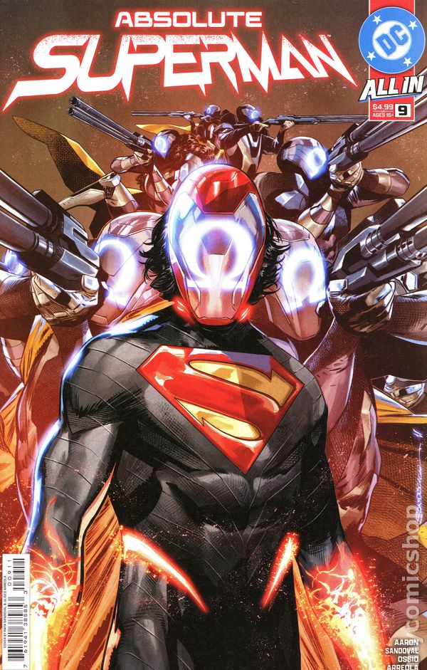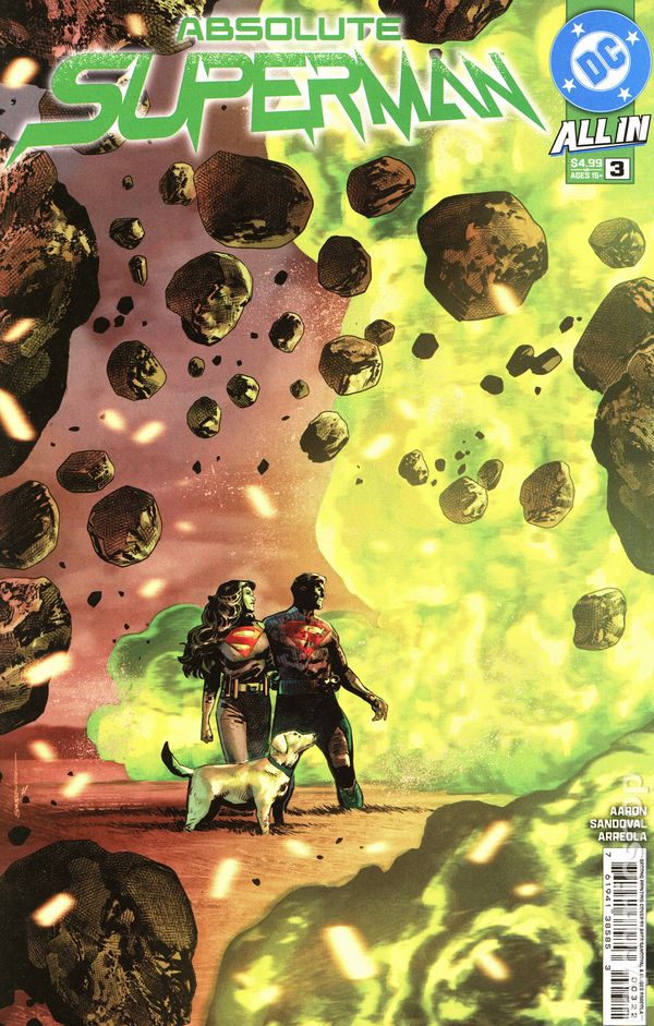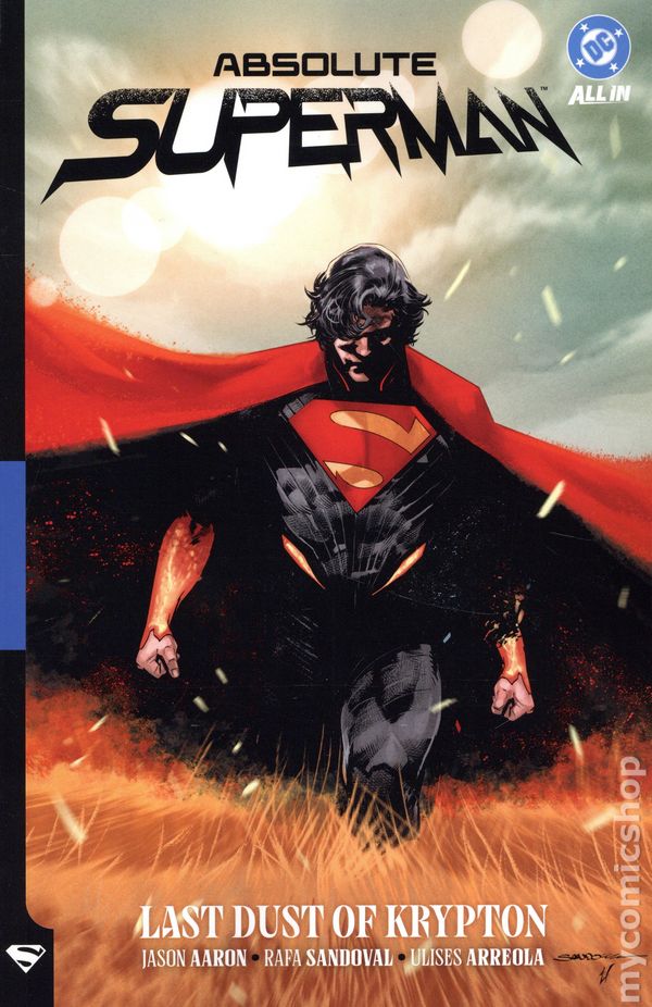 Volume 1 - 2nd and later printings. "Last Dust of Krypton!" Collects Absolute Superman (2024 DC) #1-6. Written by Jason Aaron. Art by Rafa Sandoval and Carmine Di Giandomenico. Cover by Rafa Sandoval. Spiraling out of the catastrophic events of Absolute Power, a new side of the DC Universe is born--the Absolute Universe! In a different, darker world, Kal-El landed in a remote Kansas field, the last survivor from an alien planet...but even before that moment, nothing unfolded as you'd expect. As he tries to survive in a world seemingly determined to repeat the mistakes of the demolished Krypton, he'll come into conflict with the globe-straddling Lazarus Corporation and its agenda of exploitation...and go fist- to-fist with its brutal army of Peacemakers! Best-selling writer Jason Aaron (Star Wars, Thor, Teenage Mutant Ninja Turtles) is joined by superstar artist Rafa Sandoval (The Flash, Action Comics) to reinvent Superman from the ground up! Softcover, 176 pages, full color. Teen+ Cover price $17.99.
