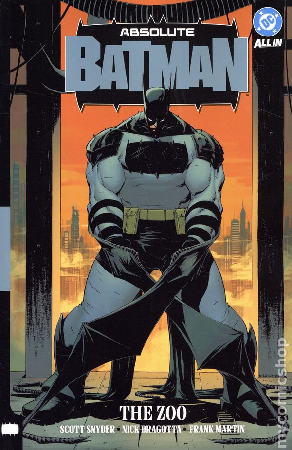 Volume 1 - 2nd and later printings. "The Zoo!" Collects Absolute Batman (2024 DC) #1-6. Written by Scott Snyder. Art by Nick Dragotta and Gabriel Hernandez Walta. Cover by Nick Dragotta. A gang of masked killers terrorizes the streets of Gotham. A vigilante fights for his city--but he's not the Batman you know. The Absolute Universe, born out of the Justice League's apocalyptic battle with Darkseid, ushers in a set of brand-new realities that reimagine your favorite heroes as you've never seen them before. In Absolute Batman, meet a young Bruce Wayne with no Wayne Manor, no Alfred by his side, and a different axe to grind as the Dark Knight. From the minds of writer Scott Snyder and artist Nick Dragotta, and featuring special guest artist Gabriel Walta, comes an origin story you won't want to miss! Softcover, 176 pages, full color. Teen+ Cover price $17.99.