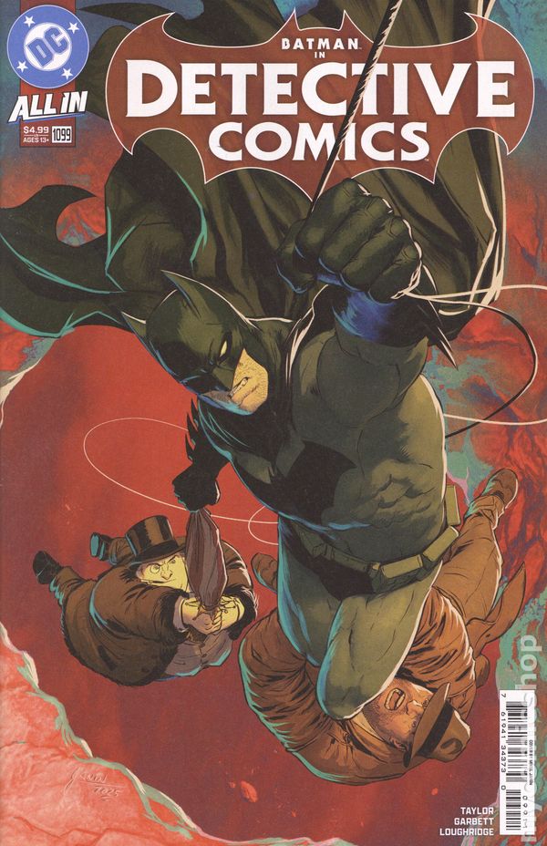 Written by Tom Taylor. Art by Lee Garbett. Cover by Mikel Janin. AN UNLIKELY ALLIANCE! Stranded far from home, Batman, Harvey Bullock, and the Penguin must form a shaky alliance to bring down the age-old immortality cult known only as Elixir. But as tensions rise among this unlikely trio, it becomes increasingly doubtful that this alliance is possible...or that the Dark Knight will ever make it back to Gotham City. 28 pages, full color. Rated T+ Cover price $4.99.