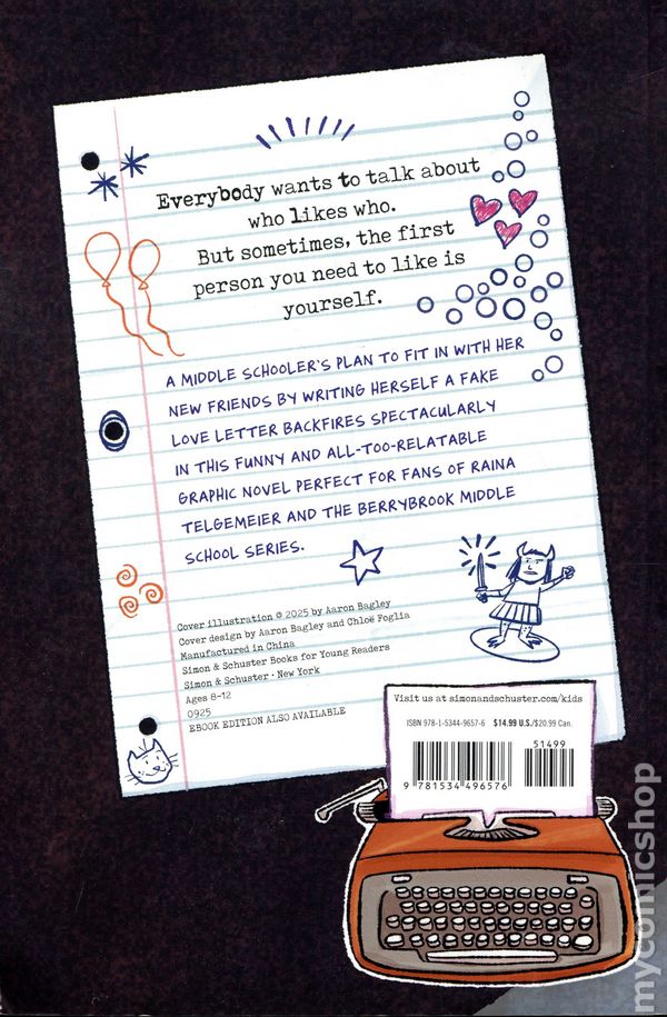 1st printing. Written by Jessixa Bagley. Art and cover by Aaron Bagley. Jackie and Milo have been best friends since they were born. Whether they're reading comic books in their tree house hideout, playing video games, or spying on their neighbors using walkie talkies and code names, it's always been the two of them versus the world. But in middle school, things are changing. Milo joins the soccer team and starts hanging out with a new crew. Jackie gets taken under the wing of Adelle, who wants to give her a total makeover and find her a crush. Suddenly, it seems like there are certain acceptable ways to be a girl or a boy, and Jackie starts to feel like everything about her is wrong. In an effort to get Adelle and her new friends off her back, Jackie sends herself an anonymous love letter. But her plan backfires, and soon Jackie's secret admirer is all anybody at school can talk about. Now she's wondering: Dear Jackie, how are you going to get out of this? Softcover, 6-in. x 9-in., 288 pages, full color. Cover price $14.99.