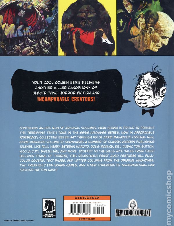 Volume 10 - 1st printing. Collects Eerie (1966-1983 Warren Magazine) #47-51. Written by Jack Butterworth, Nicola Cuti, Bill DuBay, John Jacobson, Richard Margopoulos, Esteban Maroto, Al Milgrom, Doug Moench, Greg Potter, and Steve Skeates. Art by Aldoma, Jaime Brocal, Rick Bu8ckler, Luis Dominguez, Bill DuBay, Esteban Marato, Isidro Mones (as (Munes), Paul Neary, Martin Salvador, Sanjulián, Tom Sutton, Ramon Torrents, and Enric Tottes-Prat (as Enrich). Cover by Manuel Sanjulian. Back Cover by Luis Dominguez, Enrich Torres, and Manuel Sanjulian. Foreword by Batton Lash. Continuing an epic run of archival volumes in a value priced paperback, Dark Horse is proud to present the terrifying tenth tome in the Eerie Archives series! Collecting issues #47 through #51 of Eerie magazine's original run, Eerie Archives Volume 10 showcases a number of classic Warren Publishing talents like Paul Neary, Esteban Maroto, Doug Moench, Bill DuBay, Tom Sutton, Nicola Cuti, Sanjulián, and more. Stuffed to the gills with tales from these beloved titans of terror, this delectable feast also features all full-color covers, text pages, and letters columns from the original magazines, two freakishly fun board games, and a new foreword by Supernatural Law creator Batton Lash! Softcover, 8 1/2-in. x 11 1/2-in., 272 pages, PC/PB&W. Cover price $24.99.