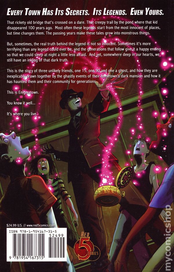 1st printing. Written by Alex De Luca. Art by Victoria Carmina and Abrielle Terzian. Cover by Gary Amaro. As featured on Free Comic Book Day! Every town has its secrets. Even yours. Three unlikely friends, Luzmarie "Luzy," 15, Frankie, 90, and Joey, a ghost, are inescapably drawn together by the ghastly events of their hometown's dark mansion and how it has haunted them and their community for generations. This is Enigmatown. You know it well... It's where you live. Softcover, 8-in. x 11-in., 160 pages, full color. Cover price $24.99.