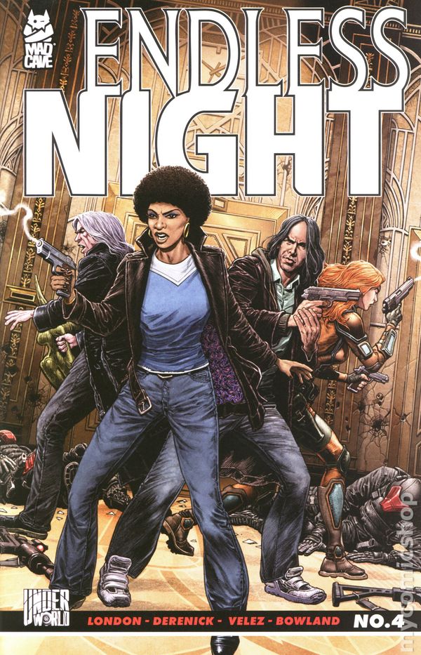 Written by Mark London. Art by Tom Derenick. Cover by Chris Weston. The evil tech billionaire AXEL BLACK finally has immense supernatural power in his grasp. What hope do the assassin VELVETEEN, detectives McCORMICK & MILLER, and monster hunter OWEN BLACKWOOD have against the new King of the World? ENDLESS NIGHT is Mad Caves miniseries event of Summer 2025, a genre-smashing collision of archetypal heroes by celebrated writer MARK LONDON (Battlecats, Hunt.Kill.Repeat.) and acclaimed artist TOM DERENICK (Justice League), set in the universe of dark conspiracies, hard-boiled mystery, and unnatural menace known as UNDERWORLD! 28 pages, full color. Rated T+ Cover price $4.99.