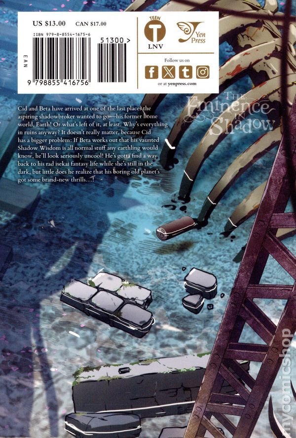 Volume 13 - 1st printing. Original Story by Daisuke Aizawa. Art and cover by Anri Sakano. Character Design by Touzai. Translated by Nathaniel Hiroshi Thrasher. Cid and Beta have arrived at one of the last places the aspiring shadowbroker wanted to go—his former home world, Earth! Or whats left of it, at least. Whys everything in ruins anyway? It doesnt really matter, because Cid has a bigger problem: If Beta works out that his vaunted Shadow Wisdom is all normal stuff any earthling would know, hell look seriously uncool! Hes gotta find a way back to his rad isekai fantasy life while shes still in the dark, but little does he realize that his boring old planets got some brand-new thrills…! Softcover, 5-in. x 7-in., 144 pages, B&W. Teen Cover price $13.00.