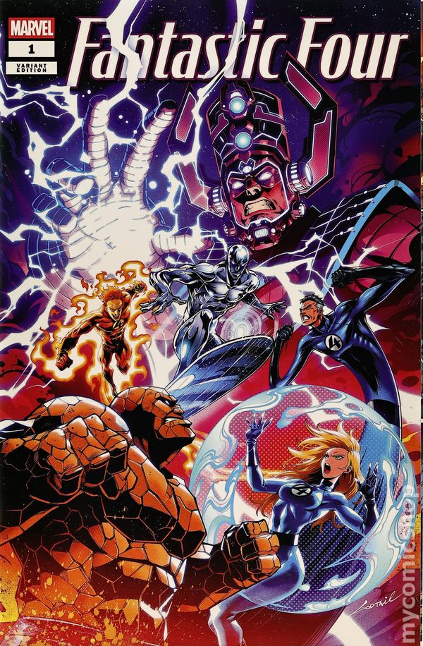 Comic Mint Exclusive Variant Cover by Godtail. Written by Ryan North. Art by Humberto Ramos. A NEW ERA FOR MARVEL'S FIRST FAMILY! The FANTASTIC FOUR return with a new issue #1, kicking off a whole new volume of their adventures through time, space, science and the human condition! When the Fantastic Four take on Doom, things go well until they suddenly go catastrophically wrong - and they're sent to four different eras in Earth's history! Alone and isolated in wildly different time periods, Reed, Johnny, Ben and Sue all have to fight to survive. Their only hope is to reach the Forever Stone: a mass of dense granite that happens to be one of the longest-lasting rocks on the planet, which - through a combination of obscurity and raw geological luck - has stayed both intact and accessible for most of Earth's history! Also featured in this extra-big, extra-special issue: Ben Grimm fights a dinosaur! No other comic DARES to feature the Thing battling several Mapusauruses, but that's just where WE get started! And it's all brought to life by the incredible new series artist Humberto Ramos! 32 pages, full color. Rated T Cover price $4.99.