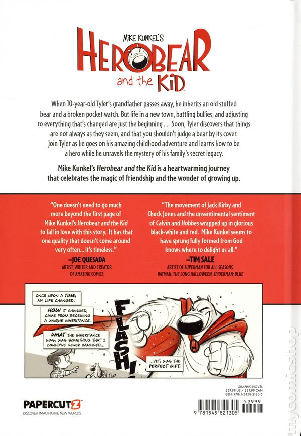 Volume 1 - 1st printing. Story and art by Mike Kunkel. When 10-year-old Tylers grandfather passes away, he inherits an old stuffed bear and a broken pocket watch. But life in a new town, battling bullies, and adjusting to everything thats changed are just the beginning . . . Soon, Tyler discovers that things are not always as they seem, and that you shouldnt judge a bear by its cover. Join Tyler as he goes on his amazing childhood adventure and learns how to be a hero while he unravels the mystery of his familys secret legacy. Mike Kunkels Herobear and the Kid is a heartwarming journey that celebrates the magic of friendship and the wonder of growing up. Hardcover, 160 pages, B&W (and Red). All Ages Cover price $19.99.