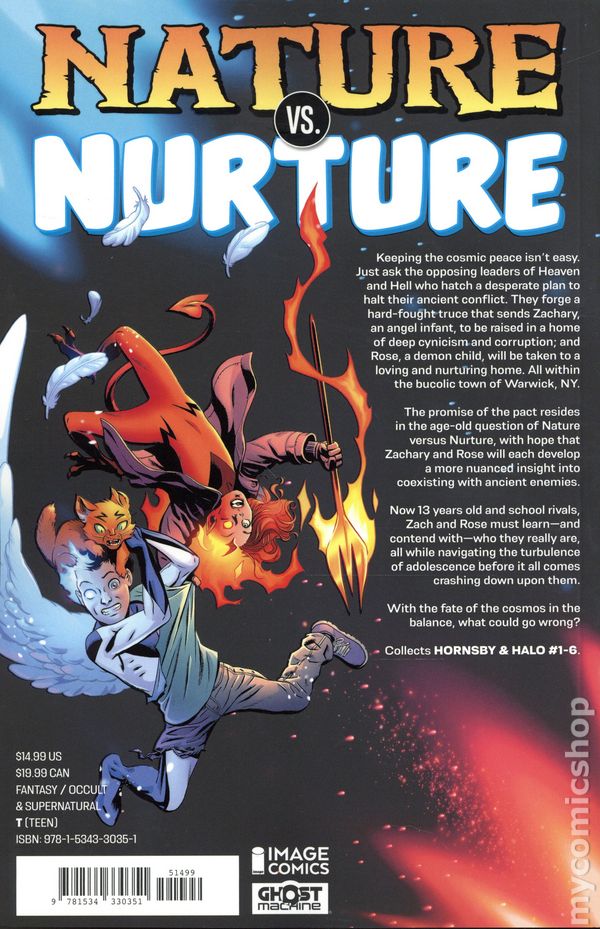 Volume 1 - 1st printing. Collects Hornsby and Halo (2024 Image) #1-6. Written by Peter J. Tomasi. Art and Cover by Peter Snejbjerg. It's Good vs. Evil from the minds of PETER J. TOMASI (Batman and Robin, Super Sons) and PETER SNEJBJERG (Starman, BPRD)! Keeping the cosmic peace isnt easy. But the opposing leaders of Heaven and Hell broker a deal that trades Zachary Halo, an angel child, to a corrupt family, and Rose Hornsby, a demon child, to a loving family, and hope this truce will halt the winds of war. Its Nature versus Nurture, as the turbulence of adolescence comes crashing down on two teenagers who have no idea just who and what they truly are...yet. Softcover, 160 pages, full color. Teen Cover price $14.99.