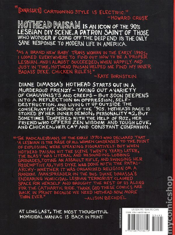 1st printing. Story and art by Diane DiMassa. Introduction by Sarah Schulman. Hothead Paisan, a murderous icon of the 90s LGBTQ+ comics scene, comes roaring back into print in this fresh edition (including a new interview and supplemental materials) of one of the funniest, sharpest, and most unexpectedly warm comics of the late twentieth century, still as shocking today as it was nearly thirty years ago. Hothead Paisan is an icon of the 90s lesbian DIY scene, a patron saint of those who wonder if going off the deep end is the only sane response to life in modern America. Diane DiMassas Hothead starts out in a murderous frenzy—taking out a variety of chauvinists and creeps—but soon deepens into a reflection on oppression, self-destruction, and living it up outside the conservative norms of the 90s. Hotheads rage is stoked by her inner demon, Personality #2, but sometimes tempered with the help of Roz, her friend who offers Zen wisdom and tough love, and Chicken, her cat and constant companion. Softcover, 456 pages, B&W. Mature Readers Cover price $34.95.