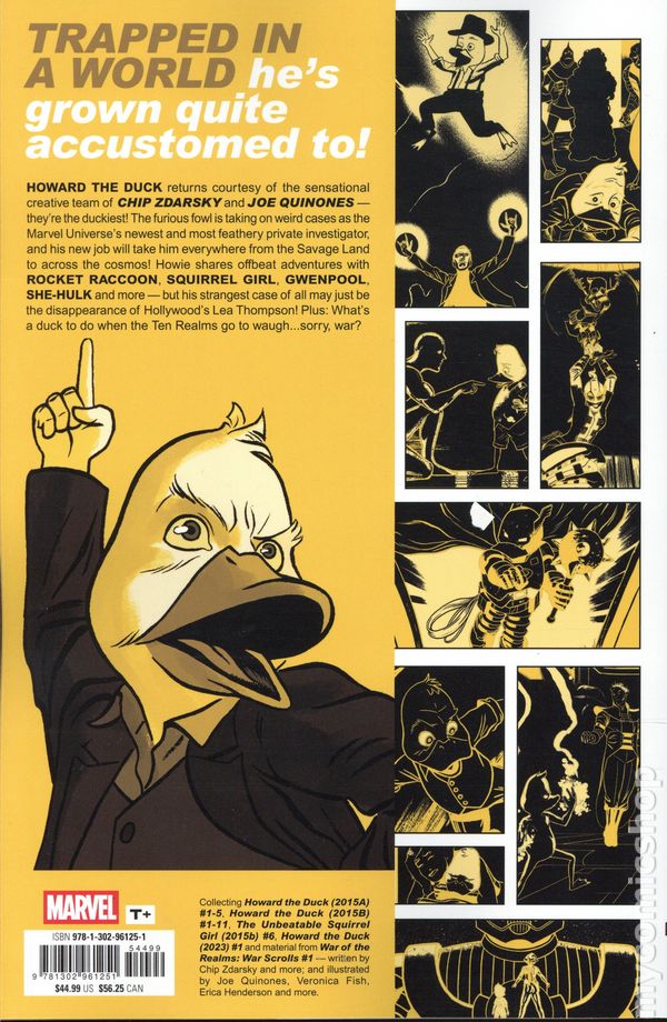 1st printing. Collects Howard the Duck (2015 4th Series) #1-5, Howard the Duck (2015 5th Series) #1-11, The Unbeatable Squirrel Girl (2015-2020 2nd Series) #6, Howard the Duck (2023 Marvel) #1, and material from War of the Realms: War Scrolls (2019 Marvel) #1. Written by Chip Zdarsky, Christopher Hastings, Ryan North, Daniel Kibblesmith, Jason Loo, and Merritt K. Art by Joe Quinones, Joe Rivera, Paolo Rivera, Rob Gullory, Jason Latour, Katie Cook, Danilo Beyruth, Rick Magyar, Goran Sudzuka, Veronica Fish, Erica Henderson, Chip Zdarsky, Marc Deering, Kevin Maguire, Jordan Gibson, Annie Wu, Derek Charm, and Will Robson. Cover by Joe Quinones. Introduction by Chip Zdarsky. Acclaimed writer Chip Zdarsky takes on Marvel's strangest star, Howard the Duck, in a hilarious satirical look at the wackiness of comics! Howard the Duck returns courtesy of the sensational creative team of Chip Zdarsky and Joe Quinones — they're the duckiest! The furious fowl is taking on weird cases as the Marvel Universes newest and most feathery private investigator, and his new job will take him everywhere from the Savage Land to across the cosmos! Howie shares offbeat adventures with Rocket Raccoon, Squirrel Girl, Gwenpool, She-Hulk and more — but his strangest case of all may just be the disappearance of Hollywoods Lea Thompson! Plus: Whats a duck to do when the Ten Realms go to waugh...sorry, war? Softcover, 496 pages, full color. Rated T+ Cover price $44.99.