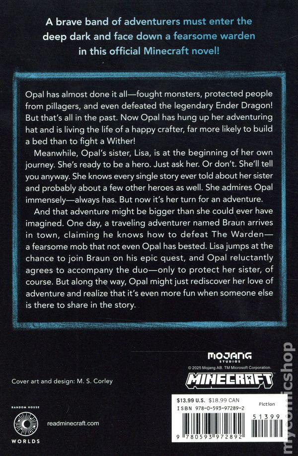 1st printing. Written by Danny Lore. Cover by M.S. Corley. The next blockbuster Minecraft novel from the bestselling publishing program--now with over five million books in print! Opal has almost done it all—fought monsters, protected people from pillagers, and even defeated the legendary Ender Dragon! But that's all in the past. Now, Opal has hung up her adventuring hat and is living the life of a happy creafter, far more likely to build a bed than to fight a Wither. In fact, Opal has decided that her time is best spent building her dream manor outside the very village that displays the Ender Dragon skull she brought back from the End! Meanwhile, Opals sister, Lisa, is at the beginning of her own journey. She's ready to be a hero. Just ask her. Or don't. Shell tell you anyway. She knows every single story ever told about her sister and probably about a few other heroes as well. She admires Opal immensely—always has. But now its her turn for an adventure. And that adventure might be bigger than she could ever have imagined. One day, a traveling adventurer named Braun arrives in town, claiming he knows how to defeat the Warden—a fearsome mob that not even Opal has bested. Lisa jumps at the chance to join Braun on his epic quest, and Opal reluctantly agrees to accompany the duo—only to protect her sister, of course. But along the way, Opal might just rediscover her love of adventure, and realize that its even more fun when someone else is there to share in the story…. Softcover, 5 1/2-in. x 8-in., 192 pages, Text Only. Age 10 and up Cover price $13.99.
