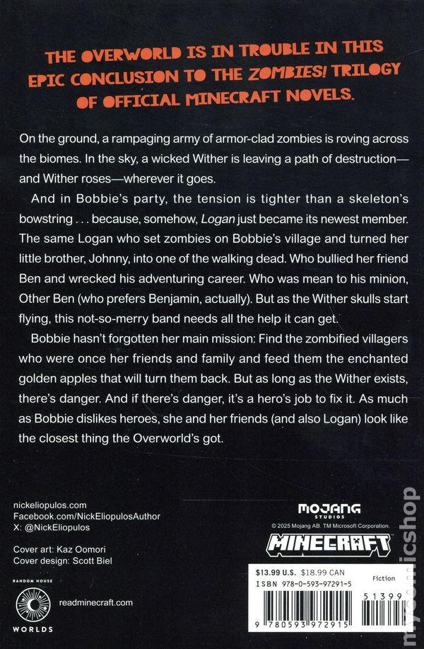 1st printing. Written by Nick Eliopulos. Cover by Kaz Oomori. The Overworld is in trouble in this epic conclusion of the Zombies! trilogy of official Minecraft novels. On the ground, a rampaging army of armor-clad zombies is roving across the biomes. In the sky, a wicked Wither is leaving a path of destruction—and Wither roses—wherever it goes. And in Bobbies party, the tension is tighter than a skeletons bowstring . . . because, somehow, Logan just became its newest member. The same Logan who set zombies on Bobbies village and turned her little brother, Johnny, into one of the walking dead. Who bullied her friend Ben and wrecked his adventuring career. Who was mean to his minion, Other Ben (who prefers Benjamin, actually). But as the Wither skulls start flying, this not-so-merry band needs all the help it can get. Bobbie hasn't forgotten her main mission: Find the zombified villagers who were once her friends and family and feed them the enchanted golden apples that will turn them back. But as long as the Wither exists, there's danger. And if there's danger, its a hero's job to fix it. As much as Bobbie dislikes heroes, she and her friends (and also Logan) look like the closest thing the Overworlds got. Softcover, 5 1/2-in. x 8-in., 208 pages, Text Only. Cover price $13.99.