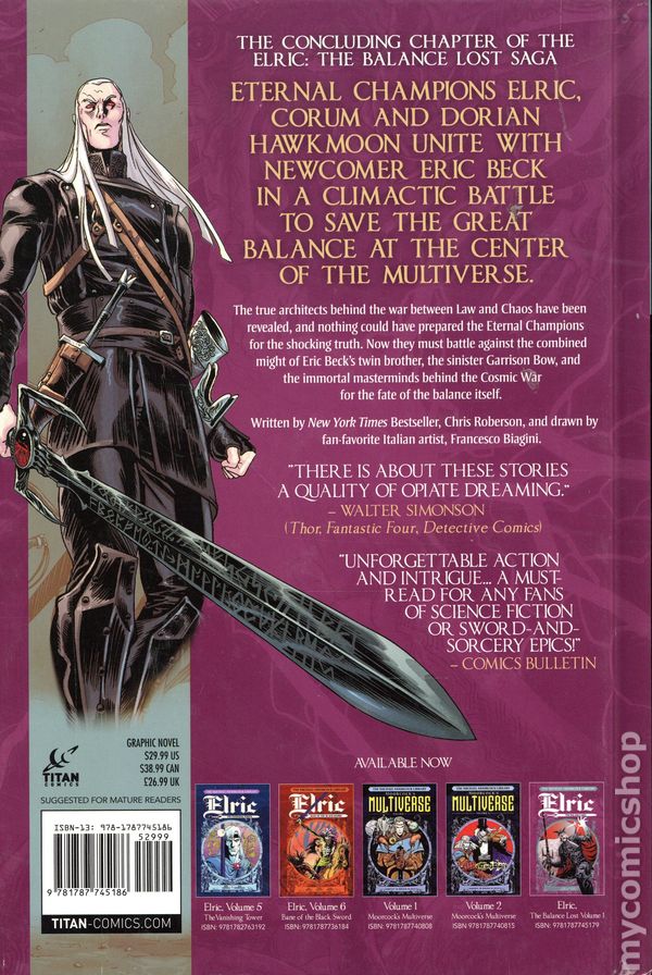 Volume 2 - 1st printing. Collects Elric: The Balance Lost (2011 Boom) #7-12. Based on the Story by Michael Moorcock. Adapted by Chris Roberson. Art and cover by Francesco Biagini. WITH THE FATE OF THE MULTIVERSE HANGING IN THE BALANCE, THE ETERNAL CHAMPIONS UNITE WITH NEWCOMER ERIC BECK IN A CLIMATIC BATTLE TO SAVE VERY SOURCE OF THE GREAT BALANCE AT THE CENTRE OF THE MULTIVERSE! Their quest to the Lost Universe has revealed the shocking truth as to who the true architects behind the war between Law and Chaos are, and nothing could have prepared the four eternal champions for the shocking truth. Now they find themselves pitted together in an epic war of unimaginable scale between both sides for the very source of the Cosmic Balance. FEATURING ALL OF MOORCOCK'S MOST FAMOUS CHARACTERS! Hardcover, 160 pages, full color. Mature Readers Cover price $29.99.