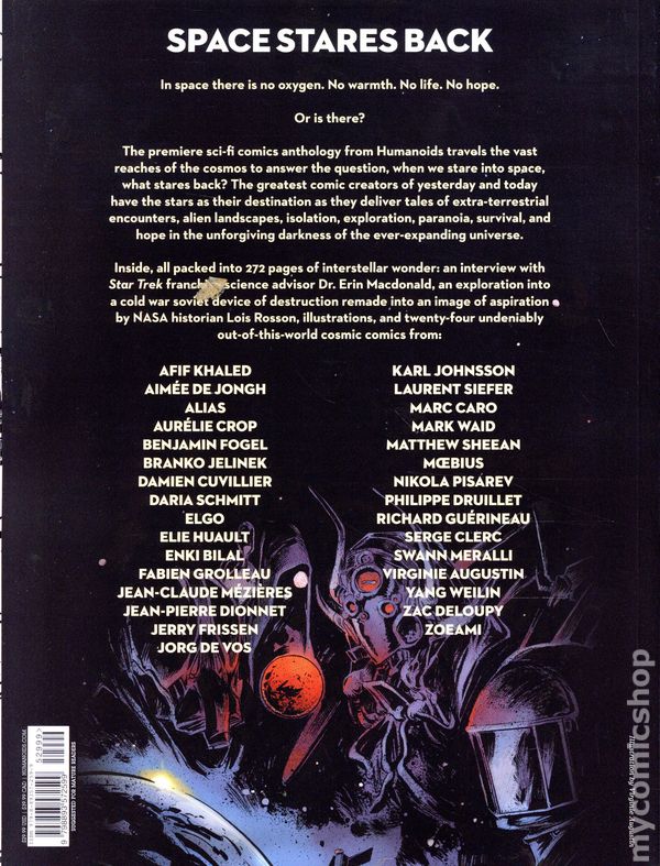 Volume 2 - 1st printing. "Space Stares Back!" Cover by Afif Khaled. Introduction by Fabrice Giger. In space there is no oxygen. No warmth. No life. No hope. Or is there? The premiere sci-fi comics anthology from Humanoids travels the vast reaches of the cosmos to answer the question, when we stare into space, what stares back? The greatest comic creators of yesterday and today have the stars as their destination as they deliver tales of extra-terrestrial encounters, alien landscapes, isolation, exploration, paranoia, survival, and hope in the unforgiving darkness of the ever-expanding universe. Inside, all packed into 272 pages of interstellar wonder: an interview with Star Trek franchise science advisor Dr. Erin Macdonald, an exploration into a German WWII device of destruction remade into an image of aspiration by NASA historian Lois Rosson, illustrations, and twenty-four undeniably out-of-this-world cosmic comics from: AFIF KHALED, AIMÉE DE JONGH, ALIAS, AURÉLIE CROP, BENJAMIN FOGEL, BRANKO JELINEK, DAMIEN CUVILLIER, DARIA SCHMITT, ELGO, ELIE HUAULT, ENKI BILAL, FABIEN GROLLEAU, JEAN-CLAUDE MÉZIÈRES, JEAN-PIERRE DIONNET, JERRY FRISSEN, JORG DE VOS, KARL JOHNSSON, LAURENT SIEFER, MARC CARO, MARK WAID, MATTHEW SHEEAN, MOEBIUS, NIKOLA PISAREV, PHILIPPE DRUILLET, RICHARD GUÉRINEAU, SERGE CLERC, SWANN MERALLI, VIRGINIE AUGUSTIN, YANG WEILIN, ZAC DELOUPY, ZOEAMI Softcover, 8 1/2-in. x 11-in., 272 pages, PC/PB&W. Mature Readers Cover price $29.99.