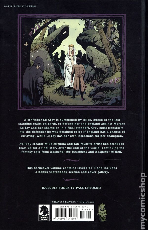 1st printing. Collects The Serpent in the Garden: Ed Grey and the Last Battle for England (2024 Dark Horse)#1-3. Written by Mike Mignola. Art by Ben Stenbeck and Mike Mignola. Cover by Ben Stenbeck. Hellboy is dead and the world as we know it is gone... but the Witchfinder is called upon to defend Avalon one last time. Witchfinder Ed Grey is summoned by Alice, queen of the last standing realm on earth, to defend her and England against Morgan Le Fay and her champion in a final standoff. Grey must transform into the defender he was destined to be if England has a chance of surviving, while Le Fay has her own intentions for her. Hellboy creator Mike Mignola and fan-favorite artist Ben Stenbeck team up for a final story after the end of the world, continuing the fantasy epic from Koshchei the Deathless and Koshchei in Hell. Includes a bonus sketchbook section and cover gallery. Hardcover, 104 pages, full color. Cover price $24.99.