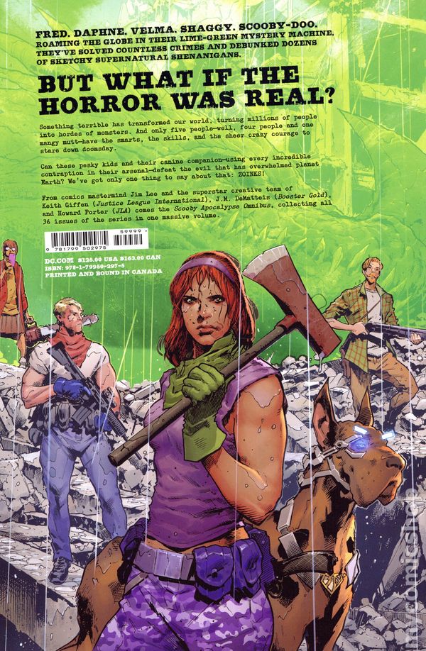 1st printing. Collects Scooby Apocalypse (2016) #1-36. Based on a Concept by Jim Lee. Written by Keith Giffen, J.M. DeMatteis, and Heath Corson. Art by Howard Porter, Willinton Alves, Chris Batista, Ben Caldwell, Howard Chaykin, Dale Eaglesham, Marc Deering, Tom Derenick, Colleen Doran, Jan Duursema, Dan Green, Yvel Guichet, Scott Hanna, Rob Hunter, Phil Jimenez, Scott Kolins, Andy Kuhn, Rick Leonardi, Sam Lotfi, Tom Mandrake, Jose Marzan, Jr., Tom Nguyen, Patrick Olliffe, Andy Owens, Tom Palmer, Sean Parsons, Bill Reinhold, Kelsey Shannon, Gus Vazquez, and Ron Wagne. Cover by Jim Lee. JINKIES! THE POST-APOCALYPTIC SCOOBY-DOO SAGA FINALLY COLLECTED IN ONE OMNIBUS! Art by Howard Porter, Wellinton Alves, Chris Batista and More Fred, Daphne, Velma, Shaggy, and Scooby-Doo face more than they bargained for when the apocalypse strikes! With creatures of the night among them, they must fight to survive in a world where the horrors are real. From comics mastermind Jim Lee and the superstar creative team of Keith Giffen (Justice League International), J.M. DeMatteis (Booster Gold), and Howard Porter (JLA) comes the Scooby Apocalypse Omnibus, collecting all 36 issues of the series in one massive volume. Hardcover, 8 1/2-in. x 11-in., 920 pages, full color. Teen Cover price $125.00.