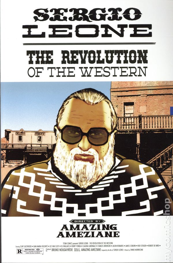1st printing. Story and art by Amazing Améziane. ILLUSTRATING THE BEHIND-THE-SCENES STORIES OF SOME OF HOLLYWOOD'S BIGGEST HITS. FROM THE CREATOR OF DON COPPOLA and QUENTIN BY TARANTINO. Following the story of the man behind the movies, Sergio Leone shows the insight behind the critically-acclaimed Dollars Trilogy director and takes a look at both the impact of his movies and the narrative of his life from his cinematic viewpoint. Softcover, 192 pages, PC/PB&W. Cover price $24.99.