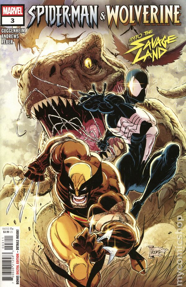 Written by Marc Guggenheim. Art by Kaare Andrews. Cover by Dan Panosian. FEAR AND LOATHING IN THE SAVAGE LAND! Things were wild in New York, but wait'll you see LOGAN and PETER PARKER in the SAVAGE LAND! What grim hunt dogs them to this brutal of places? If you read the last issue, you know one of our heroes might not make it out alive. See the fallout of issue #2 play out in this landmark issue! 28 pages, full color. Rated T+ Cover price $3.99.