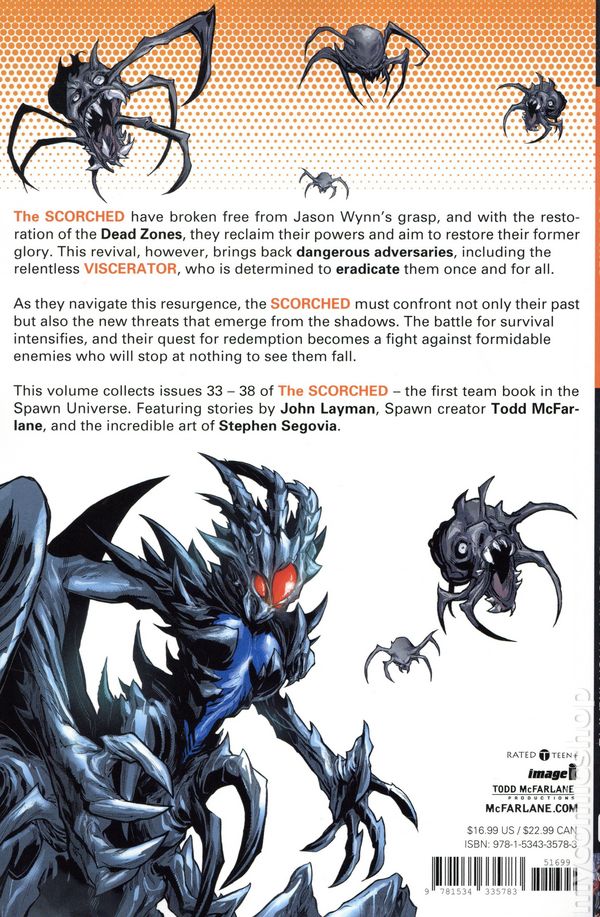 Volume 6 - 1st printing. Collects Spawn: The Scorched (2021 Image) #33-38. Written by John Layman and Todd McFarlane. Art by Stephen Segovia, Dudu Pansica, and Julio Ferreira. Cover by Daniel Henriques. Back Cover by Stephen Segovia. THE SCORCHED have freed themselves from Jason Wynn's control, and with the Dead Zones restored, they regain their powers and seek to reclaim their glory. However, this resurgence also revives formidable foes, including the relentless VICERATOR, who aims to eliminate them for good. Softcover, 144 pages, full color. Cover price $16.99.