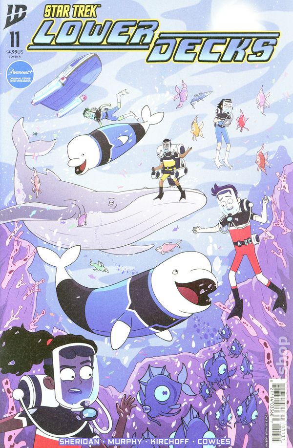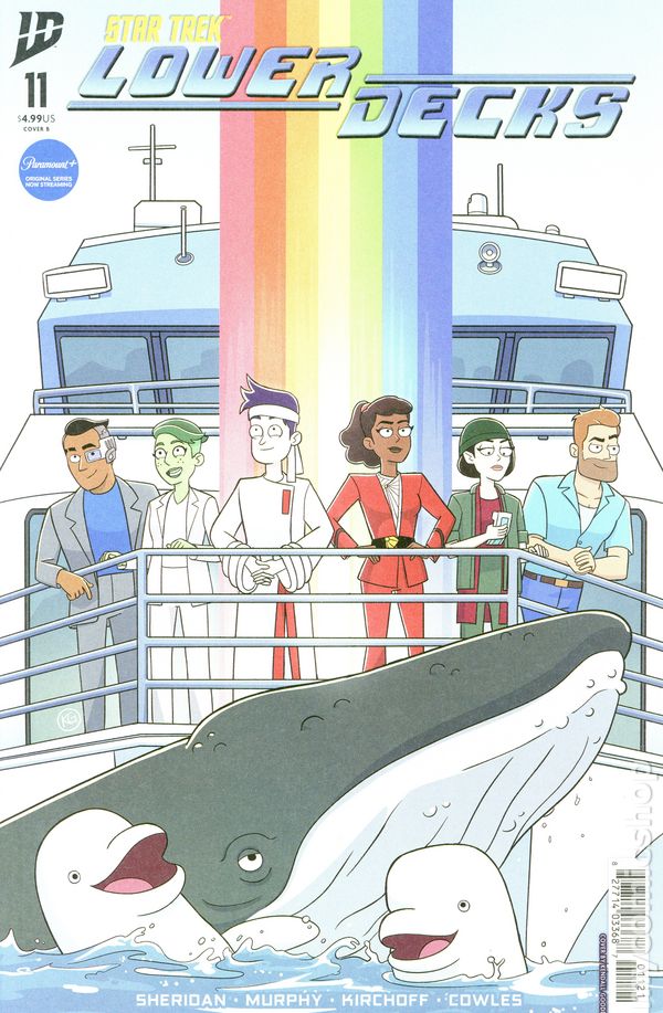 Written by Tim Sheridan. Art by Philip Murphy. Cover by Philip Murphy. Sqeak, squaw, sssskkkaaa, eh, eee.[Translation: Cetacean Ops here! Matt and I have brought the crew of the U.S.S. Cerritos back to the year 1987 for a top-secret mission of great import.]HHHkkkeeeeee, ska, ska, EeeEEAaa. Squaw, squaw. *Click, cliiiiick*[Translation: Thats right, Kimolu. We need their help to fix what that blowhole Kirk messed up by bringing the whales George, Gracie, and Ronald to Earth without a way for them to repopulate its oceans. What was Ronald supposed to do, have babies with his mother?]Skkkesaw. Eehhh, ee, ee, AaaaaAa. AH, AH, EeeEE! Sqqqqaw.[Translation: But the remaining humpbacks have all heard freaky conspiracy theories about what happened to the last pod who went to Earth. To save the species, the Lower Deckers will have to dissuade them of the rumors and convince them Earth is worth inhabiting. Ah-yikes.]This issue kicks off the penultimate arc of this seasons run, so be sure to order whale ahead of time! 28 pages, full color. Cover price $4.99.