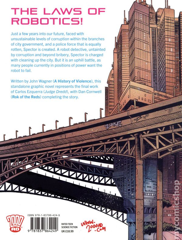 1st printing. Written by John Wagner. Art by Carlos Ezquerra and Dan Cornwell. Cover by Dan Cornwell. Just a few years into our future, faced with unsustainable levels of corruption within the branches of city government, and a police force that is equally rotten, Spector is created. A robot detective, untainted by corruption and beyond bribery, Spector is charged with cleaning up the city. But it is an uphill battle, as many people currently in positions of power want the robot to fail. Written by John Wagner (A History of Violence), this standalone graphic novel represents the final work of Carlos Ezquerra (Judge Dredd), with Dan Cornwell (Rok of the Reds) completing the story. Softcover, 8-in. x 11-in., 112 pages, full color. Cover price $24.99.
