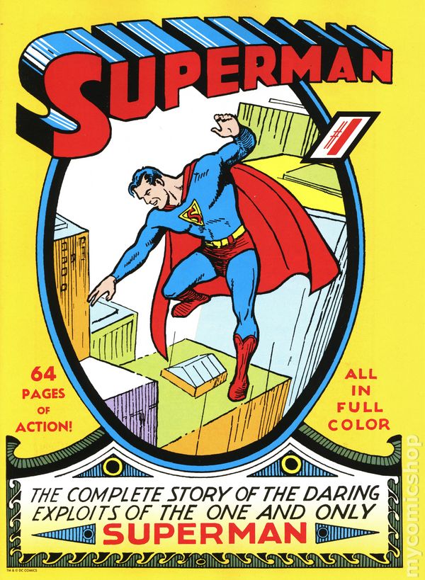 Written by Jerry Siegel. Art by Joe Shuster. Cover by Joe Shuster, Leo O Mealia. THE EPIC FIRST ISSUE, REPRINTED IN FACSIMILE FORMAT! See the origin of Superman retold as the infant Kal-El escapes the destruction of Krypton and is adopted by the kindly Kents on Earth. Then, thrill to the early escapades of the Man of Tomorrow as he saves an innocent woman from the electric chair, foils a plot to foment war, and champions the cause of workers' rights as a reporter for the Daily Star! 64 pages, full color. Rated T+ Cover price $9.99.