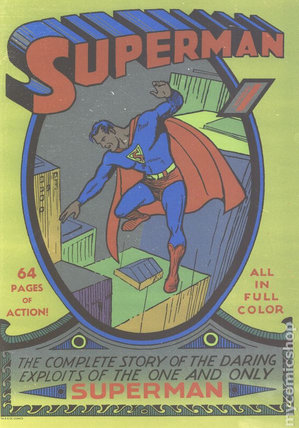 Foil Cover. Written by Jerry Siegel. Art by Joe Shuster. Cover by Joe Shuster, Leo O Mealia. THE EPIC FIRST ISSUE, REPRINTED IN FACSIMILE FORMAT! See the origin of Superman retold as the infant Kal-El escapes the destruction of Krypton and is adopted by the kindly Kents on Earth. Then, thrill to the early escapades of the Man of Tomorrow as he saves an innocent woman from the electric chair, foils a plot to foment war, and champions the cause of workers' rights as a reporter for the Daily Star! 64 pages, full color. Rated T+ Cover price $12.99.