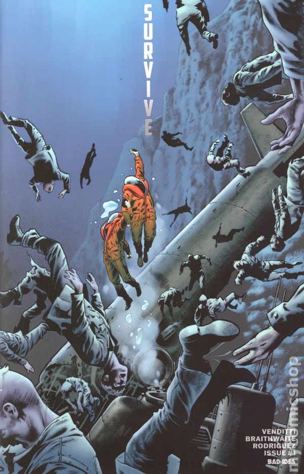 Written by Robert Venditti, Various. Art by Doug Braithwaite, VARIOUS. Cover by Artruro Lozzi. The Russian Akula-class submarines orders were simple: escort the cargo ship Turgenev across the Atlantic and safely deliver her to Cubas shores. But someone aboard has a competing mission–sabotage. Now a fiery explosion has punched through its titanium hull, turning the once-prized vessel of the Russian fleet into a watery tomb. 100 ft down and sinking fast, two lone survivors remain, a Russian sailor and an American spy, the final combatants in a warzone only four hundred feet long and forty feet wide. Locked in heated battle, and buried under the weight of an entire ocean, each man is determined to kill the other before time runs out. But the fight to survive only starts on the ocean floor as these two men are pushed to their limits and beyond in a fight against each other, the deadliest environment on Earth, and their own military forces to complete their missions and make it out alive as the world hangs in the balance. 48 pages, full color. Rated T+ Cover price $5.99.