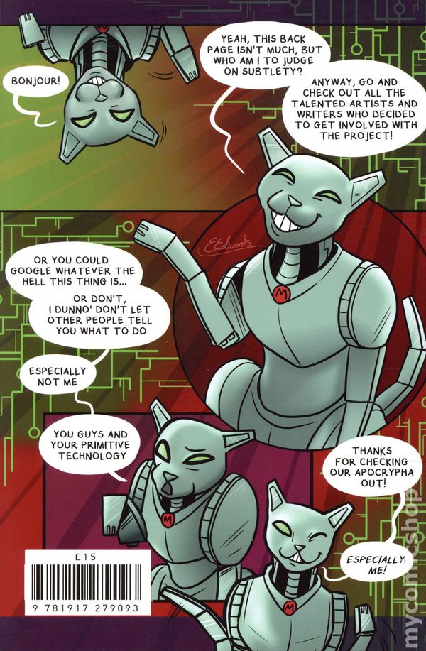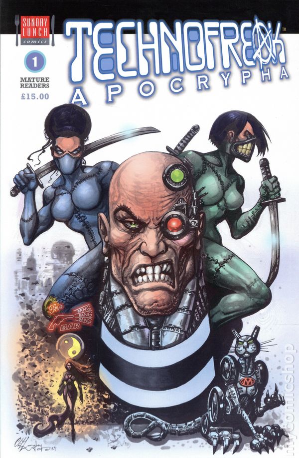 1st printing. Written by John Charles, Mark Spencer, Kevin Gunstone, Christoff RDGZ, Barry May, Alan Holloway, Sophie Good, and Adrian Tooth. Art by Mike Walters, Tom Newell, Keith Reynolds, Clint Langley, Emily Edwards, John Charles, David Esobar, Adrian Bamforth, David Lyttleton, Barry May, Keith Hopewell, Andy Lambert, Vassilis Gogtzillas, Ade Brown, Antonio Valjean Goncalves, Adrian Tooth, Beth McInnes, and Clint Langley. Cover by Clint Langley. Introduction by John Charles. TechnoFreak Apocrypha #1 continues the adventures of Jon Sherlok in the dystopian London of the 31st century. The last of the Technofreaks, Jon is part man, part machine, and is arguably the smartest man on the planet, and quite possibly the drunkest too. Meet Maurice, Jon's sarcastic robot cat, and Loretta, the love of his life, as well as Neville Brady, a one-man wrecking crew, and Greta Krauss, Neville's no-nonsense German sweetheart. It's an action-packed roller-coaster ride as Jon rights wrongs, fights foes, and saves damsels in distress, but mostly hangs out in pubs, living his best life. Softcover, 88 pages, full color.