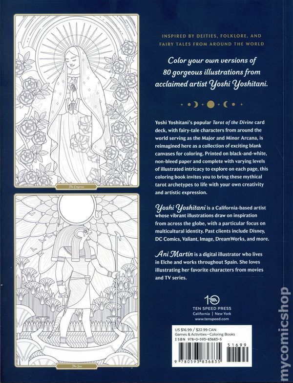 1st printing. By Yoshi Yoshitani. Inspired by deities, folklore, and fairy tales from around the world, this 80-page adult coloring book features gorgeous illustrations from acclaimed artist Yoshi Yoshitanis popular tarot deck. Tarot of the Divine Coloring Book features bold black-and-white versions of Yoshi Yoshitani's delightfully intricate illustrations, perfect for putting colored pens or pencils to paper and bringing the mythical tarot archetypes to life with your own creativity. Tarot of the Divine Coloring Book presents each tarot card from the Tarot of the Divine deck, with fairytale characters from around the world serving as the Major and Minor Arcana. The Danish fable's naive Little Mermaid represents The Fool, China's Beauty and the Beast are The Lovers, the Maori legend of Hinemoa and Tutanekai serve as The World, and more. Fans of coloring books are invited to craft their own world of beauty and fantasy by bringing life to Yoshi Yoshitanis illustrations of fables from cultures across the globe. Softcover, 7 3/4-in. x 10-in., 80 pages, B&W. Cover price $16.99.