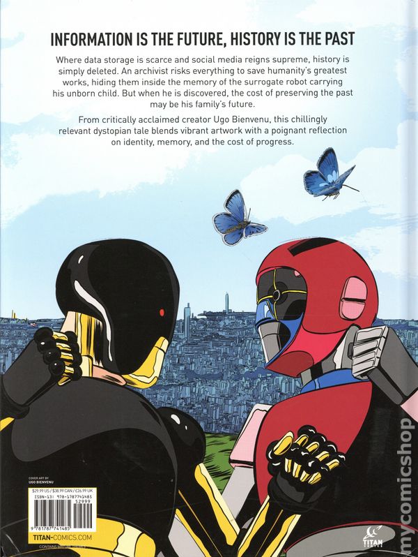 1st printing. Story and art by Ugo Bienvenu. Translated by Edward Gauvin. A BLACK MIRROR-ESQUE FUTURE-SHOCK SATIRE! Critically-acclaimed writer, artist and director Ugo Bienvenu presents a beautifully illustrated graphic novel which takes a dark introspection on the future of the world of the social media. In the near future, society lives in a social media metaverse where data storage is at a premium and historic works of art are simply deleted to make space for holiday photos. Appalled by this way of life, an archivist risks everything by stealing and hiding culturally important artefacts inside the robot acting as the surrogate carrier of his unborn daughter. Hardcover, 8-in. x 11-in., 176 pages, full color. Mature Readers Cover price $29.99.