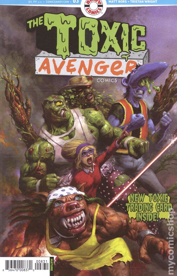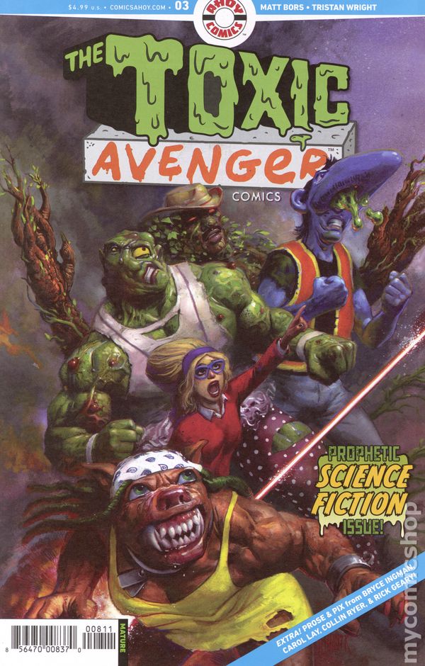 Written by Matt Bors. Art by Tristan Wright. Cover by Tristan Wright. First issue, following on the heels of the all-new TOXIC AVENGER movie! In the aftermath of the chemical spill that created Toxie, other mutations arose—all gross, all weird, and some evil! Join in the rebirth of the greatest and grossest animated-series sensation of all time: THE TOXIC CRUSADERS—Nozone, Junkyard, Fungirl, Major Disaster, and Toxic Avenger himself. 28 pages, full color. Rated M Cover price $4.99.