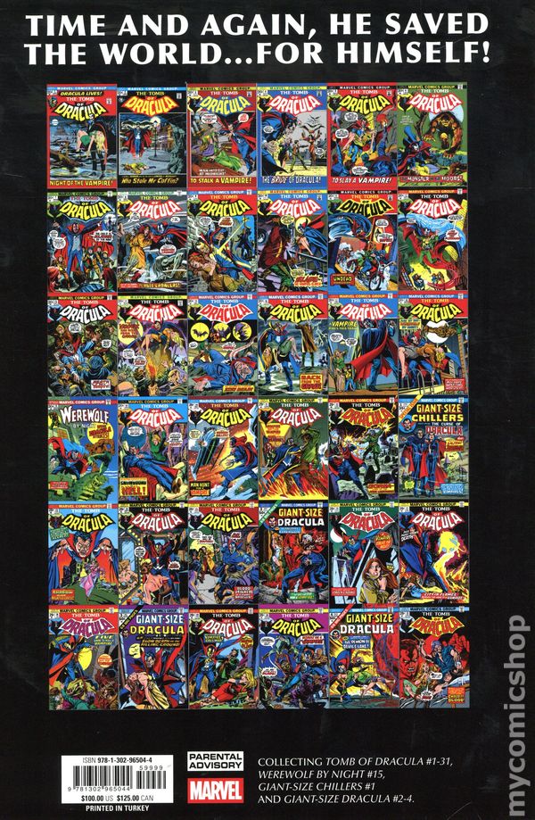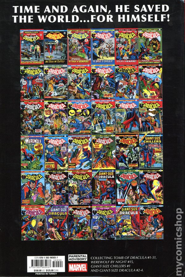 3rd Edition - Volume 1 - 1st printing. Collects Tomb of Dracula (1972-1979 1st Series) #1-31, Werewolf by Night (1972-1977 1st Series) #15, Giant-Size Chillers (1975) #1 and Giant-Size Dracula (1974) #2-4. Written by Marv Wolfman, Gerry Conway, Archie Goodwin, Gardner F. Fox, Chris Claremont, and David Anthony Kraft. Art by Gene Colan, Mike Ploog, Don Heck, Tom Palmer, Vince Colletta, Ernie Chan, Jack Abel, Frank Chiaramonte, and Frank Springer. Cover by Gene Colan. THE LORD OF VAMPIRES STARS IN AN ACCLAIMED SERIES FROM MARVEL'S CLASSIC ERA OF HORROR! He rose from the grave in 1972, ushering in an Age of Horror like nothing seen before or since! Now behold the Prince of Darkness' first encounters with his most implacable enemies of the era, including legendary Blade the Vampire Hunter! With ghosts, mutants, mad scientists and more! Plus: A tour of the Lord of the Vampires' earlier U.S. activities, with such stops as the Pool of Blood and the Devil's Heart! Featuring Werewolf by Night and Lilith, Daughter of Dracula! Hardcover, 784 pages, full color. Parental Advisory Cover price $100.00.