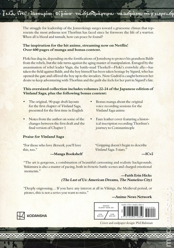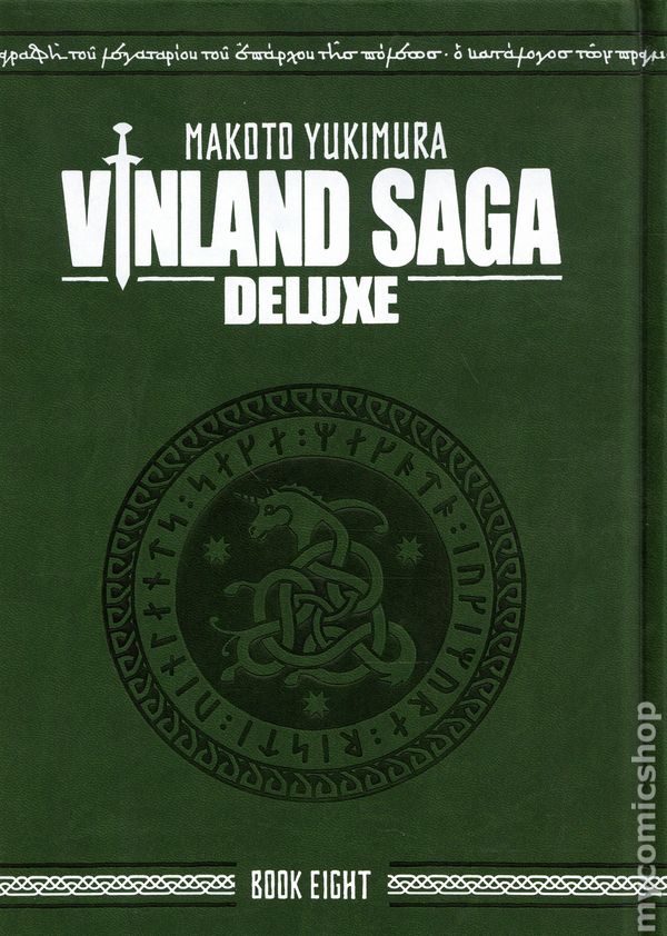 Volume 8 - 1st printing. Collects Vinland Saga HC (2013- Kodansha) Vol. 22-24. Story and art by Makoto Yukimura. Translated by Stephen Paul. The beloved manga action epic that inspired the hit anime returns in this premium collectors hardcover, including volumes 22–24 of the Japanese edition and original bonus content! The struggle for leadership of the Jomsvikings surges toward a gruesome climax that represents the most arduous test Thorfinn has faced since he foreswore the life of a warrior. When all is blood and tumult, how can peace be found? Floki has dug in, depending on the fortifications of Jomsborg to protect his grandson Baldr from the rebels. But, without and within, the tide turns against the aging master of manipulation. Enraged by the assassination of rebel leader Vagn, the battle-mad Thorkell—Flokis erstwhile ally—has taken the field against Baldr, and the boy himself has been taken hostage by Sigurd, who has opened the gate and offered the boy up to the invaders. Now Gudrid is caught between her desire to keep adventuring with Thorfinn and the guilt she feels for her part in Sigurds fate. Meanwhile, the vicious, dizzying duel between Thorfinn and Garm rages on the rooftops… This premium, hardcover edition presents the acclaimed action epic in hardcover, at a bigger size than ever before (7 by 10 inches), wrapped in a dark green leather-patterned cover with logo stamping. This new edition features all the content of the original release, plus new and exclusive bonus illustrations, interviews, and behind-the-scenes details never before translated. This oversized collection includes volumes 22-24 of the Japanese edition of Vinland Saga, plus exclusive bonus content: The original, 90-page draft layouts for the first chapter of Vinland Saga, presented for the first time in English. Notes from the author on some of the changes between the first draft and the final version of Chapter 1. Bonus manga about the original voice recording sessions for the Vinland Saga anime. Faux leather cover featuring a historical inscription recording Thorfinns journey to Constantinople Hardcover, 640 pages, B&W. Mature Readers Cover price $54.99.