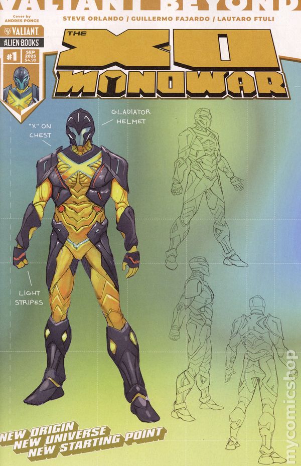 Written by Steve Orlando. Art by Guillermo Fajardo. Cover by Andres Ponce. A NEW ERA OF SUPERHERO STORYTELLING BEGINS HERE! Designed as the ULTIMATE jumping-on point, the Valiant Beyond line of comics are ABSOLUTE must-reads that will ENERGIZE your love for superheroes! The mighty Aric of Dacia, aka X-O Manowar, traverses a deadly wasteland filled with mutated horrors in a search for honor in this CAN'T-MISS debut issue from GLAAD award nominated writer Steve Orlando (Avengers Assemble) and superstar artist Guillermo Fajardo (RESURGENCE)! Aric's strength and resilience are put to the test when he comes to the defense of a family under siege from a mysterious gang known as the Earthborn. Aric finds himself aligned with a rebel group which puts him firmly in the crosshairs of the Earthborn's leader Typhon. Can Aric survive his journey across the Red Steppe? Get locked and loaded for a four-part adventure with an all-new 28 page debut issue available at a special introductory price. It's X-O Manowar like you've never seen him before! 28 Pgs, FC, M. Cover price $4.99.