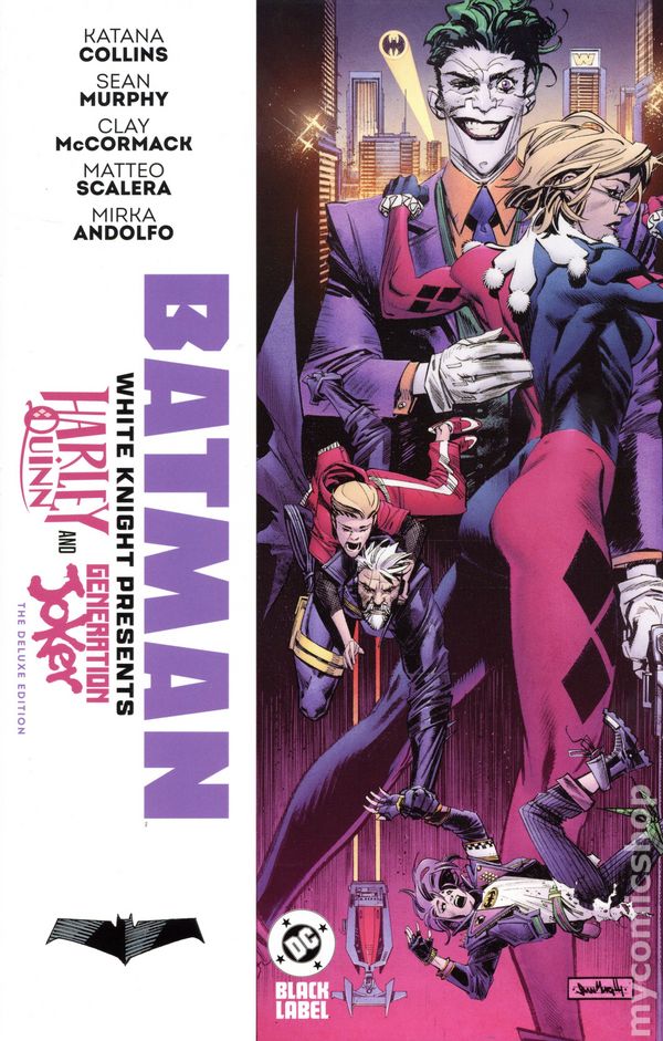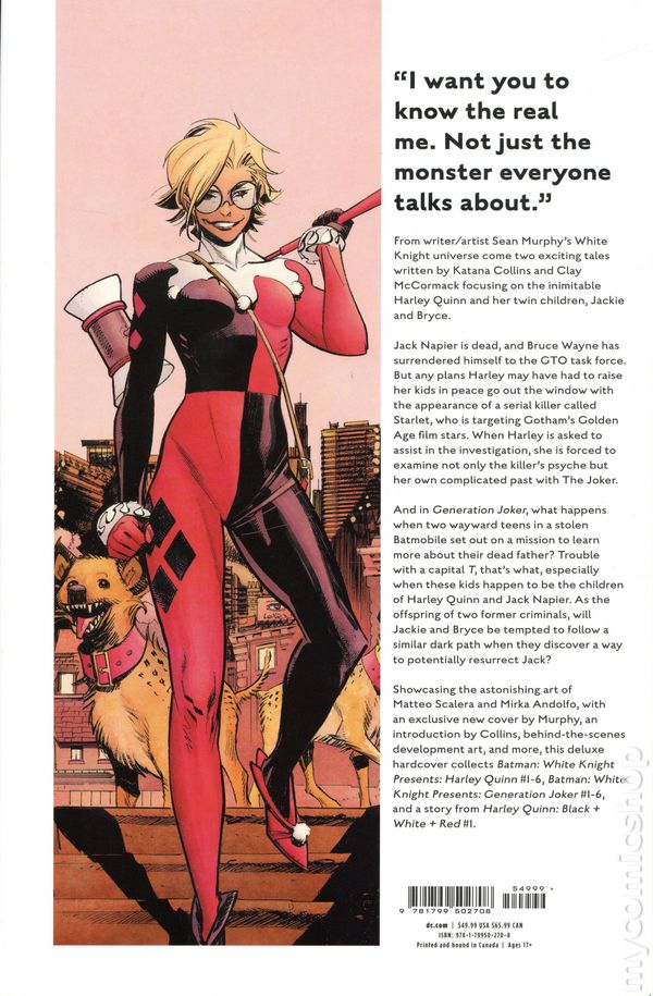 1st printing. Collects Batman: White Knight Presents Harley Quinn (2020 DC) #1-6, Batman: White Knight Presents: Generation Joker (2023 DC) #1-6, and a story from Harley Quinn Black + White + Red Digital Chapter 6. Written by Sean Murphy, Katana Collins, and Clay McCormack. Art by Matteo Scalera and Mirka Andolfo. Cover by Sean Murphy. Introduction by Katana Collins. I want you to know the real me. Not just the monster everyone talks about. From writer/artists Sean Murphys WHITE KNIGHT universe come two exciting tales written by Katana Collins and Clay McCormack focusing on the inimitable Harley Quinn and her twin children, Jackie and Bryce. Jack Napier is dead, and Bruce Wayne has surrendered himself to the GTO task force. But any plans Harley may have had to raise her kids in peace go out the window with the appearance of a serial killer called Starlet, who is targeting Gothams Golden Age film stars. When Harley is asked to assist in the investigation, she is forced to examine not only the killers psyche but her own complicated past with The Joker. And in GENERATION JOKER, what happens when two wayward teens in a stolen Batmobile set out on a mission to learn more about their dead father? Trouble with a capital T, thats what, especially when these kids happen to be the children of Harley Quinn and Jack Napier. As the offspring of two former criminals, will Jackie and Bryce be tempted to follow a similar dark path when they discover a way to potentially resurrect Jack? Showcasing the astonishing art of Matteo Scalera and Mirka Andolfo, with an exclusive new cover by Murphy, an introduction by Collins, behind-the-scenes development art, and more! Hardcover, 7 1/2-in. x 11-in., 368 pages, full color. Mature Readers Cover price $49.99.