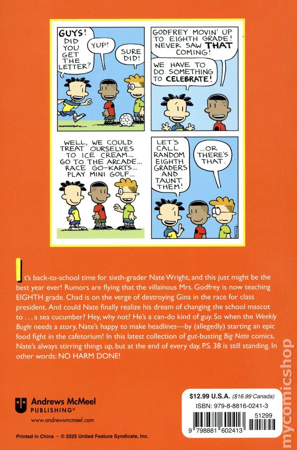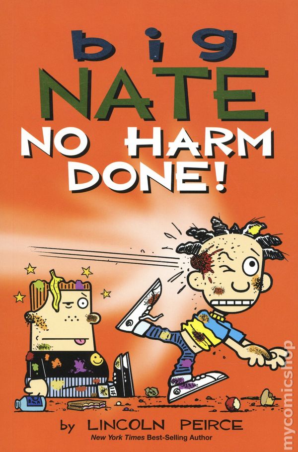 1st printing. Story and art by Lincoln Peirce. It's back-to-school time for sixth-grader Nate Wright, and this just might be the best year ever! Rumors are flying that the villainous Mrs. Godfrey is now teaching eighth grade. Chad is on the verge of destroying Gina in the race for class president. And could Nate finally realize his dream of changing the school mascot to... a sea cucumber? Hey, why not? He's a can-do kind of guy. So when the Weekly Bugle needs a story, Nate's happy to make headlines-by (allegedly) starting an epic food fight in the cafetorium! In this latest collection of gut-busting Big Nate comics, Nate's always stirring things up, but at the end of every day, P.S. 38 is still standing. In other words: No Harm Done! Softcover, 6-in. x 9-in., 176 pages, full color. Cover price $12.99.